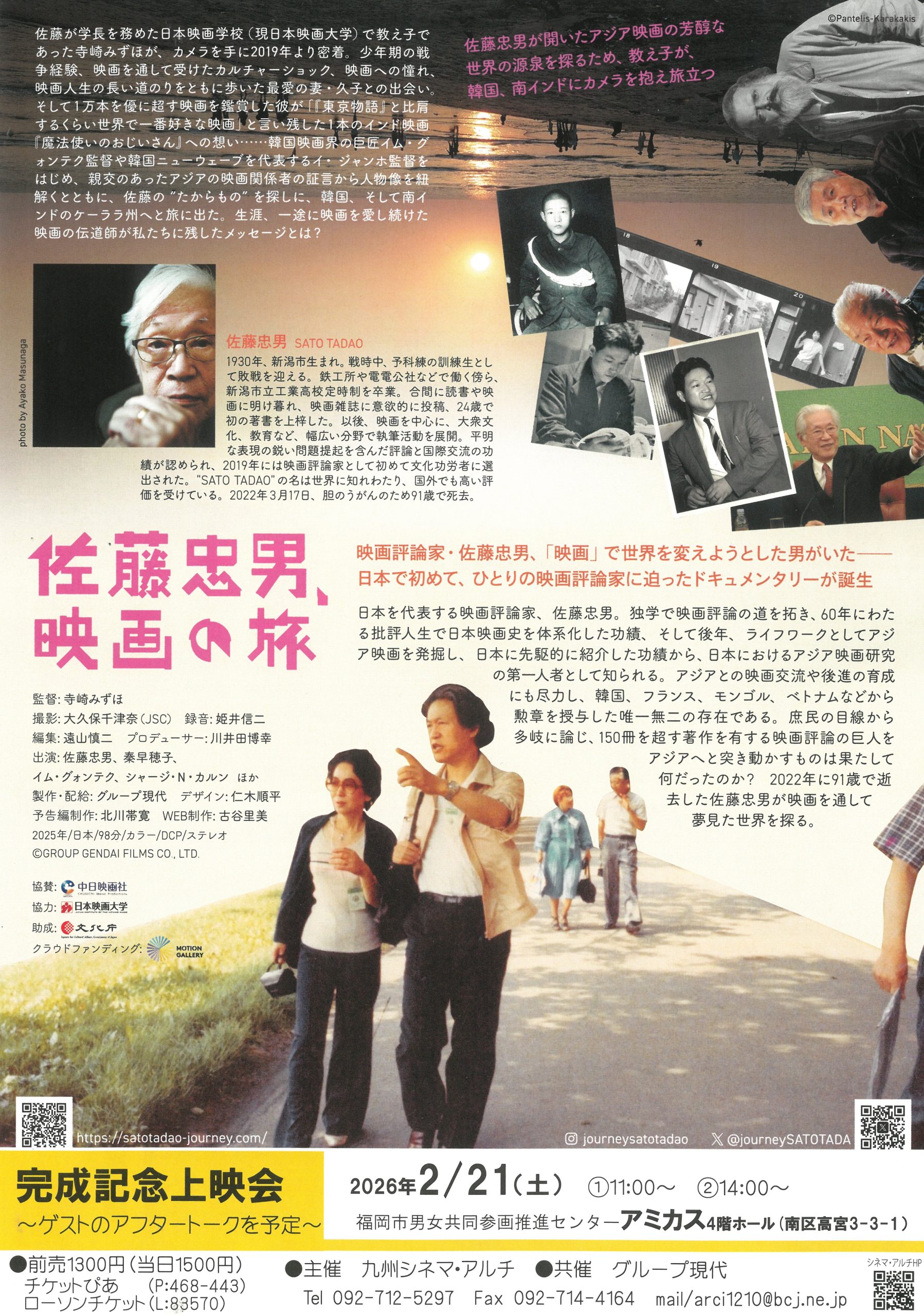 「佐藤忠男、映画の旅」 ドキュメンタリー <98分> ポスターの裏面 公式サイトへ ≫ 福岡初上映! 各回ゲストによるアフタートークを予定 日本を代表する映画評論家佐藤忠男のドキュメンタリー。映画批評に人生をささげ、映画によるアジアの開放を夢見た男の物語。 監督:寺崎みずほ 出演:佐藤忠男、イム・グォンテク、シャージ・N・カルン 他